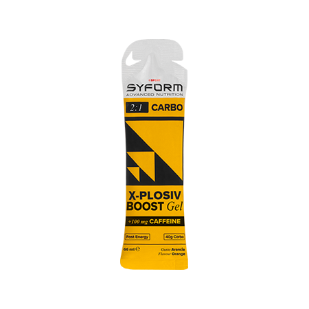 X-Plosiv Boost Gel da 66 ml è un gel concentrato a base di carboidrati a diversa velocità di assorbimento che rispetto al formato PRO addiziona 100 mg di caffeina per gel; è in grado di fornire un apporto energetico molto rapido e protratto nel tempo. Grazie alla presenza di caffeina dotata di un’azione stimolante sul sistema nervoso X-Plosiv Boost facilita la trasmissione dell’impulso nervoso, migliora il focus, l’umore e da un contributo al metabolismo energetico. X-Plosiv Boost contiene ben 40g di carboidrati, è a base di Maltodestrine D.E.19, fruttosio e destrosio con rapporto 2:1, ideale per sostenere il fabbisogno energetico durante l’esercizio fisico intenso e duraturo. Gli studi scientifici ci confermano che per poter ottenere il massimo della propria performance muscolare, è necessario assumere un’elevata quantità di zuccheri all’ora. Per ottenere questo risultato l’assunzione contemporanea di glucosio e fruttosio in rapporto 2:1 tra loro, piuttosto che glucosio da solo, è fondamentale. Il rapporto 2:1 consente al muscolo di assimilare fino a 90 g/h (grammi per ora) di carboidrati senza determinare discomfort intestinale. Per assunzioni superiori si consiglia di utilizzare Fusion Gel, con rapporto maltodestrine fruttosio 1:1. Sino a pochi anni fa sembrava che l’organismo potesse assimilare al massimo 60 g/h di carboidrati sottoforma di glucosio. Quindi si è scoperto che l’assunzione di miscele di carboidrati diversi migliorava la presta-zione, in particolare la miscela di glucosio fruttosio 2:1 ha permesso di raggiungere i 90 g/h perché consente all’organismo di sfruttare due diverse porte d’ingresso di zuccheri nell’intestino. Il glucosio entra per la porta GLUT1 mentre il fruttosio per la porta GLUT5. X-Plosiv Boost bypassa veloce lo stomaco e viene rapidamente assorbito; ha una leggera nota aromatica per favorire una maggiore equilibrio funzionale del muscolo. Un altro aspetto da tenere in considerazione è il timing di assunzione di carboidrati durante l’esercizio fisico. In particolare entro le prime due ore di attività fisica intensa, quando le scorte di glicogeno sono ancora elevate, sembra sia da preferire il rapporto 2:1, mentre per le ore successive, probabilmente per l’insorgere della fatica e la riduzione delle scorte di glicogeno sia da preferire il rapporto 1:1.